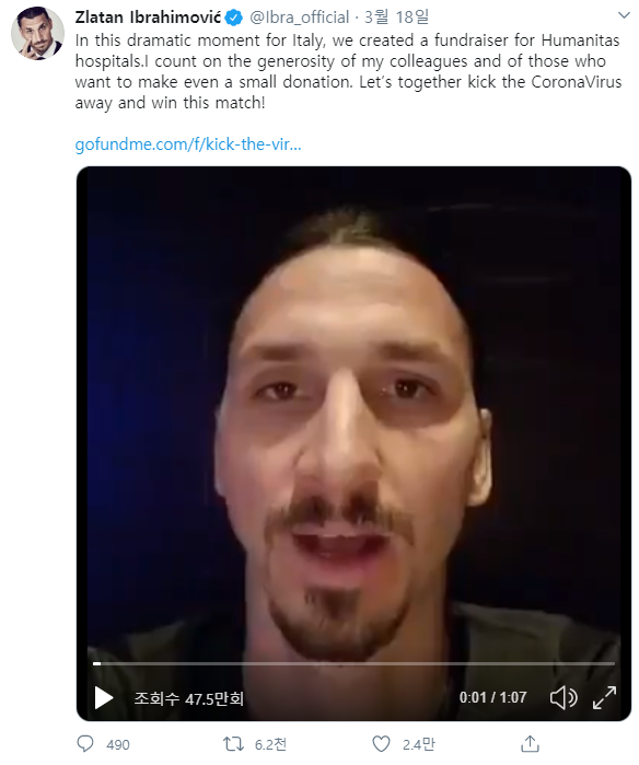 이탈리아 코로나19 확산 방지 사업을 위한 모금운동을 시작한 즐라탄. 이에 앞서 약 10만유로를 기부했다고도 합니다.