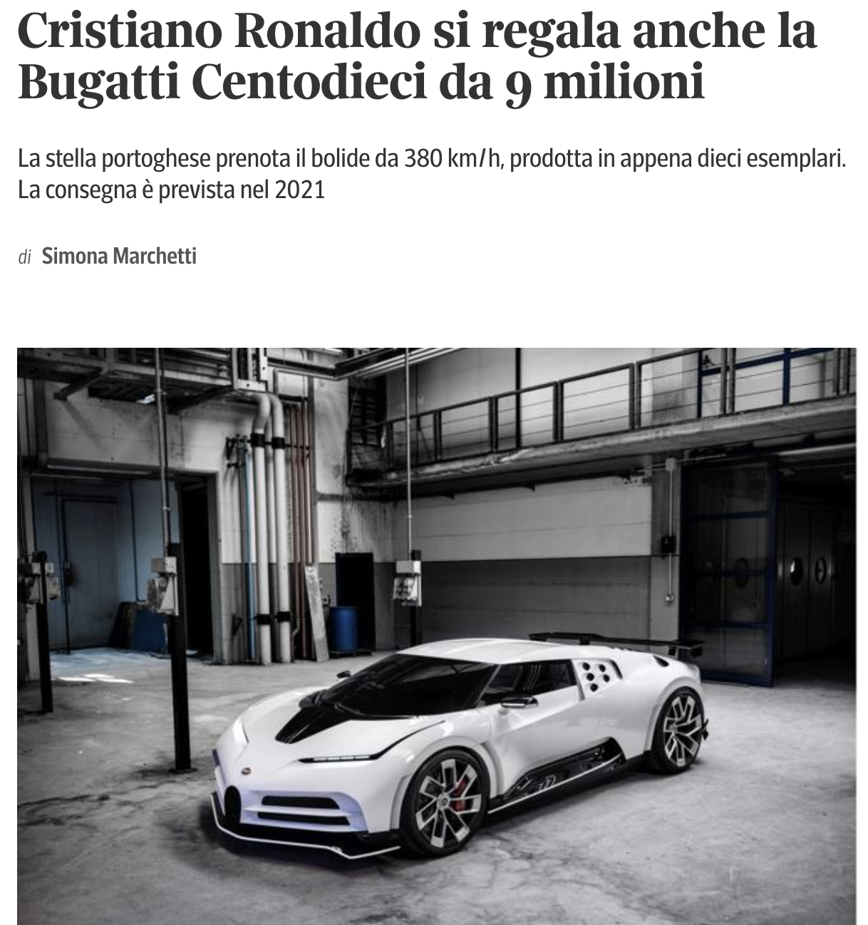 출처 : https://www.corriere.it/sport/20_marzo_27/cristiano-ronaldo-si-regala-anche-bugatti-centodieci-9-milioni-7e16eb6e-706e-11ea-9477-b8f453c01beb.shtml?cmpid=tbd_115549f0hw