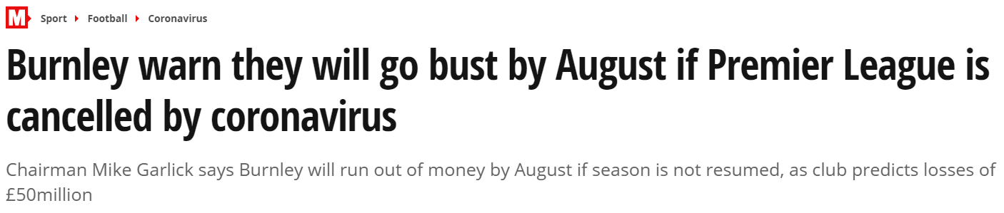 | [미러] 번리는 리그가 취소되면 8월에 파산 예정 | |