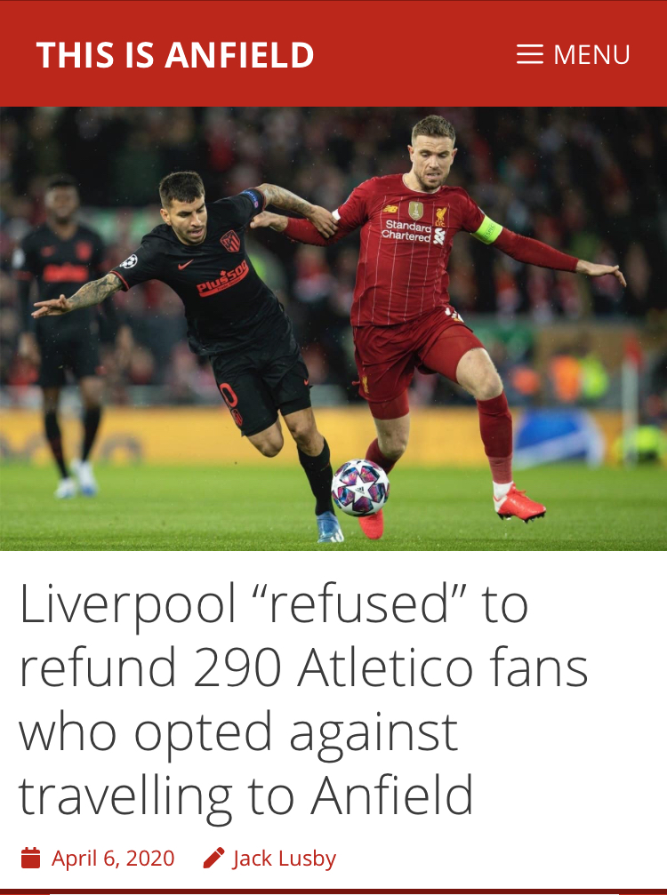[리버풀은 코로나사태로 못 온 아틀레티코 팬 입장권 환불을 거절]