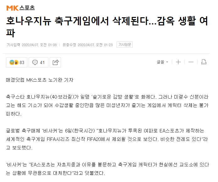 [호나우지뉴 감옥생활의 여파로 축구게임에서 삭제된다]