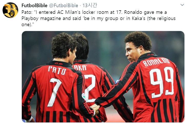파투 : "17세 때 AC 밀란의 라커룸에 들어 갔다. 당시 호나우두는 나에게 플레이보이 잡지를 주며 내 그룹에 들어오거나 카카의 그룹에 들어가라"라고 말했다. (카카의 그룹이란 종교인을 의미하는 듯??)