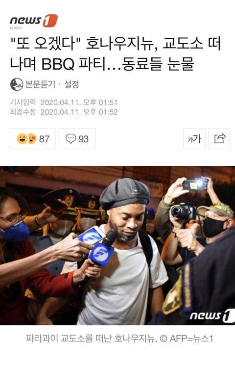 -ESPN은 11일(한국시간) 소식통을 인용해 "호나우지뉴가 32일 간의 파라과이 교도소 수감을 마치고 떠났다. 수감자들은 호나우지뉴에게 작별 인사를 하기 위해 바비큐 파티를 하면서 눈물을 흘렸다"고 보도했다.