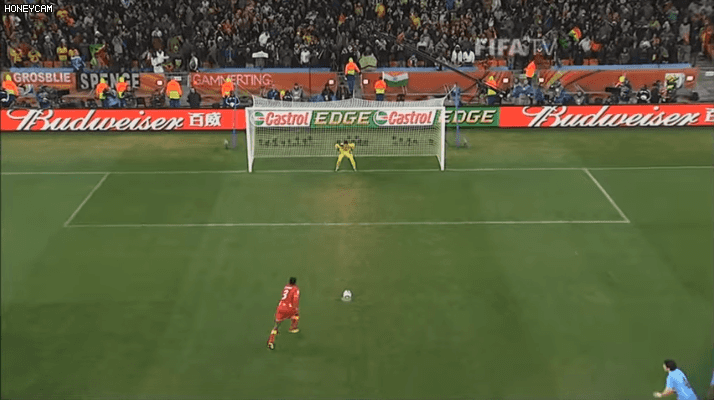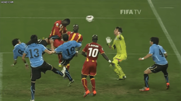 연장 후반 동점 상황에서 나온 가나의 완벽한 슈팅.(득점이나 다름 없었음) 근데 그걸 손으로 쳐내버리는 수아레스