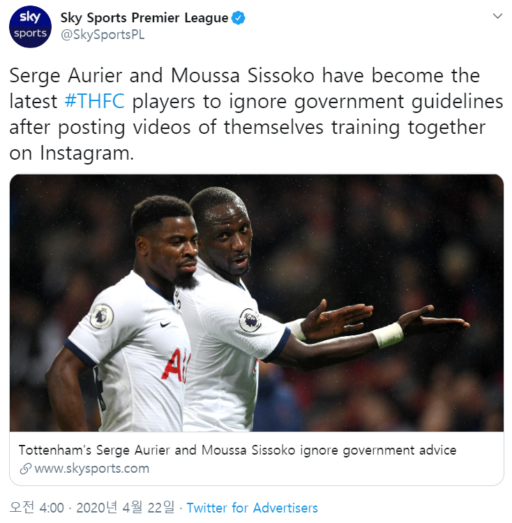 토트넘의 오리에와 시소코는 인스타그램에 함께 훈련하는 영상을 올렸다. 이는 영국 정부 지침인 사회적 거리두기를 위반하는 상황이라 논란이 됨. 현재는 "올바른 모범을 보이지 않음"에 대해 사과하고 NHS에 기부하기로 약속
