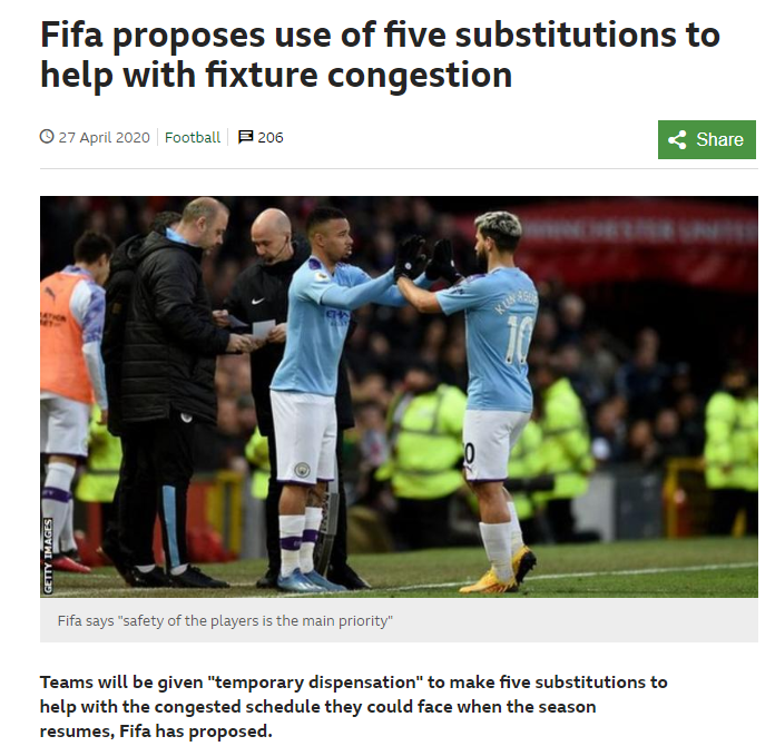 각 구단은 리그가 재개될 시 일어날 혼잡한 일정을 대비해 5명의 교체 카드를 사용할 수 있을 것 - 피파 제안
