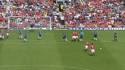 놀랍게도 장거리 프리킥까지 역발상 프리킥을 날립니다. 베컴의 대담함과 자신감을 볼 수 있는 장면이죠. 오른발로 왼쪽 골대를 향해 감아차는 프리킥은 봐도봐도 충격적이네요.