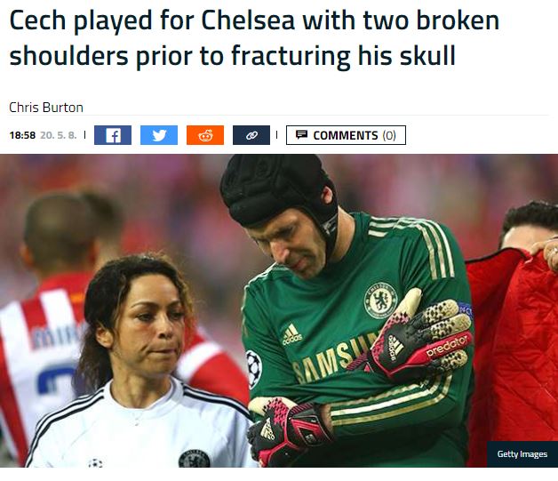 첼시 레전드 체흐는 그가 첼시에서 통증을 감내하며 경기를 뛰었다고 말한다. 체흐는 그가 두개골 골절을 당하기 전인 첼시에서의 2번째 시즌을 어깨가 탈골된 상태에서 뛰었다고 밝힌다. 그는 첼시에서 11년을 뛰었으며 494 경기에 출전하며 4번의 리그 우승, 리그컵 3회, 챔스 1회 그리고 유로파 1회 우승을 경험했다. 그러나 그는 첼시에서 순탄한 길만 걸은 건 아니다. 생명에 위협을 가한 레딩전 사건이 있었다.