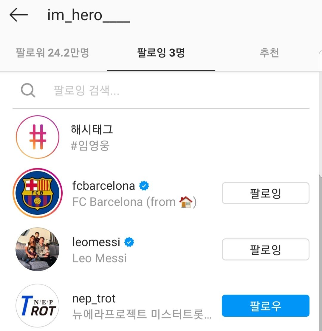 딱 세 개 있는데 바르셀로나, 메시, 미스터트롯 계정ㅋㅋㅋㅋ 뭉찬보니 축구 좀 하던데. 메시 팬인가보네요ㅋㅋ