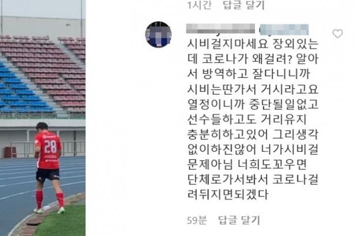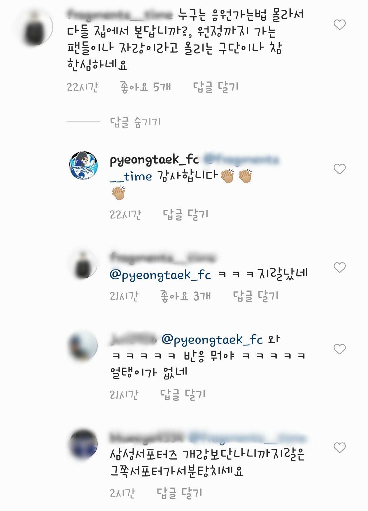 또한 평택시민축구단의 팬은 “시비 걸지 마세요. 장외에 있는데 코로나가 왜 걸려? 알아서 방역하고 잘 다니니까 시비는 딴데 가서 거시라고요”라면서 “열정이니까 중단 될 일 없고 선수들하고도 거리유지 충분히 하고 있어 그리 생각 없이 하진 않아. 너가 시비 걸 문제 아님 너희도 꼬우면 단체로 가서 봐서 코로나 걸려 뒤지면 되겠다”고 조롱했다.