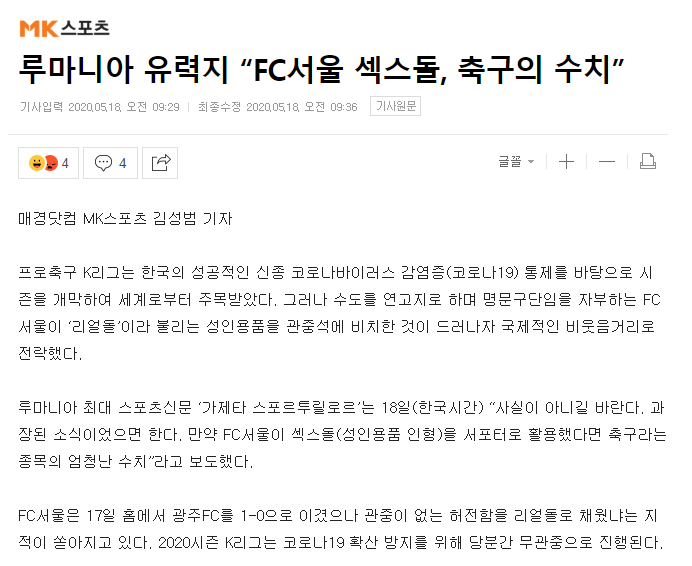 | 루마니아 유력지 "FC서울의 ㅅㅅ돌, 축구계의 수치" | |