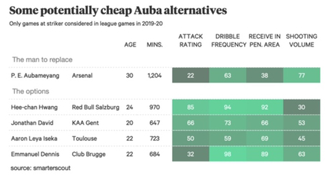 스마터 스카우터를 다시 활용하여 우리는 그를 대체 가능한 이상적인 선수들 목록을 뽑아낼 수 있다. 아래의 표가 아우바메양의 대체자 목록이다.