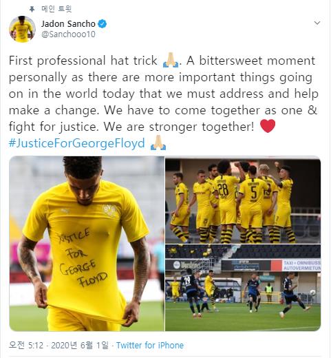 “첫 헤트트릭. 오늘 세상에는 우리가 반드시 언급하고 변화를 위해 도와야 하는 중요한 일들이 벌어지고 있어서 개인적으로 달콤 씁쓸한 순간입니다. 우리는 정의를 위해 함께 싸워야 합니다. 함께면 더 강합니다”