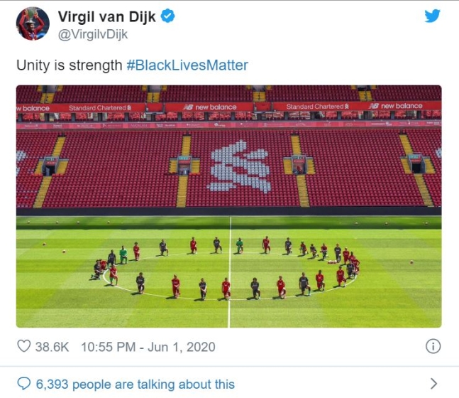 리버풀 선수들이 훈련 과정에서 센터 서클에 집합, 모든 선수들이 일정 간격을 두고 '무릎 꿇기'에 동참했다.