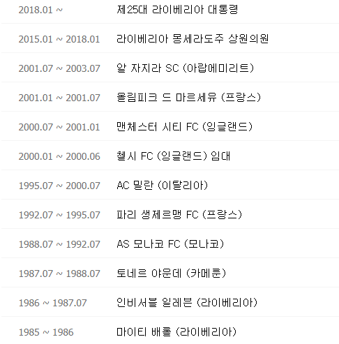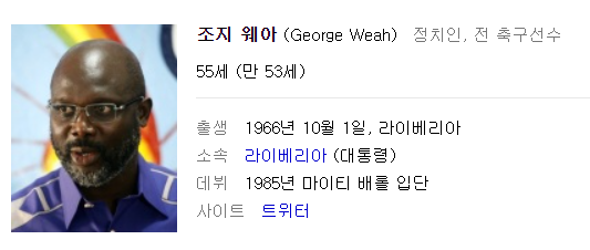 현 라이베리아 대통령인 조지 웨아. AC밀란, PSG, 첼시 등을 거친 조지 웨아는 95년 발롱도르까지 수상한 레전드 선수죠.