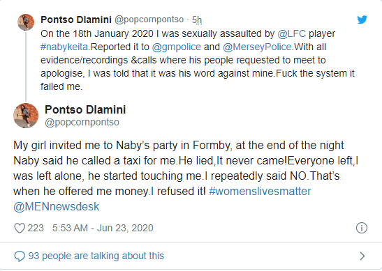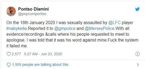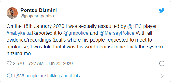트위터에서 나비 케이타에게 성폭행을 당했다고 주장하는 Pontso Dlamini