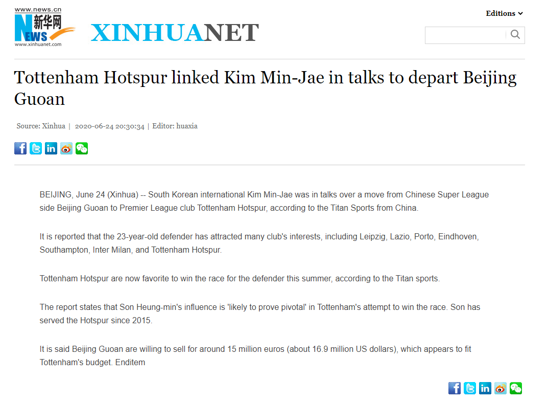 [[신화통신] 토트넘, 베이징 궈안과 김민재 협상중]