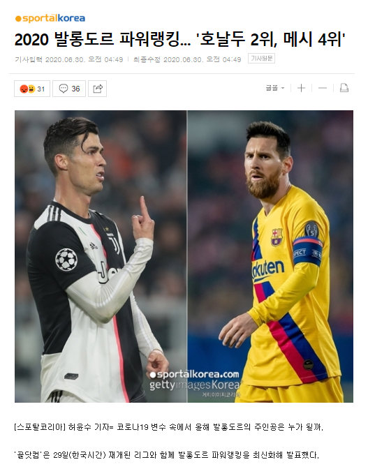 [2020 발롱도르 파워랭킹 발표! '호날두 2위, 메시 4위']