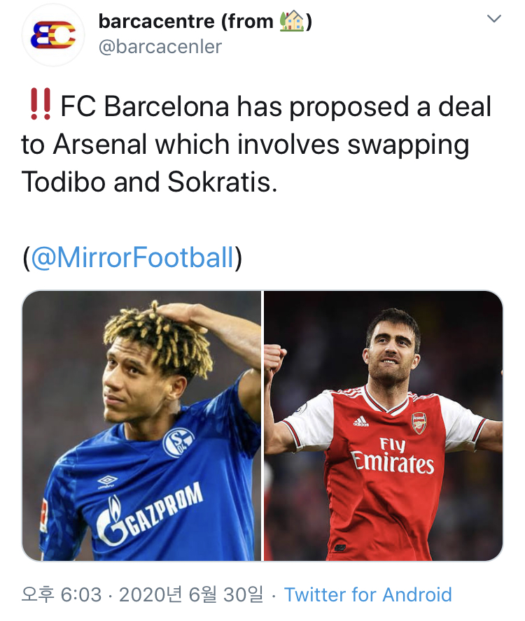 [바르셀로나, 아스날에 소크라티스-토디보 트레이드 제안]