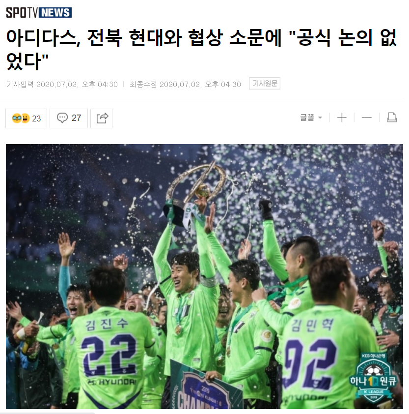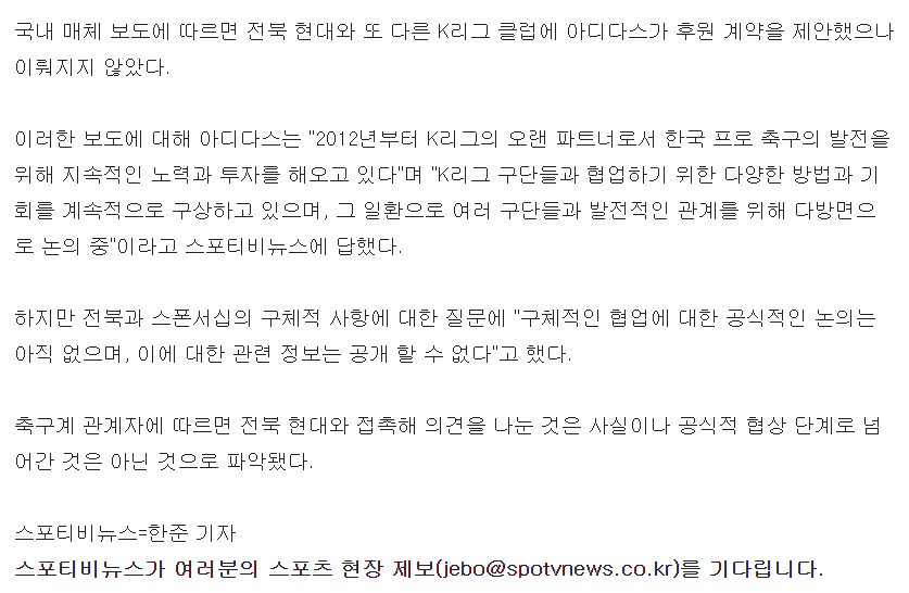 | 아디다스, "전북 현대와 스폰서 관련 공식 논의 없었다" | |