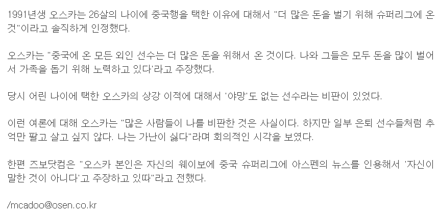 | 오스카 "가난이 싫다. 중국 리그 온건 솔직히 돈 때문.." | |