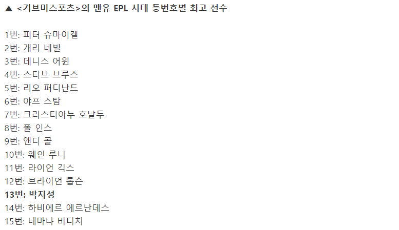 영국 언론 <기브미스포츠>가 잉글랜드 프리미어리그(EPL) 시대의 맨체스터 유나이티드에서 박지성을 역대 최고의 ‘13번’으로 꼽았다.