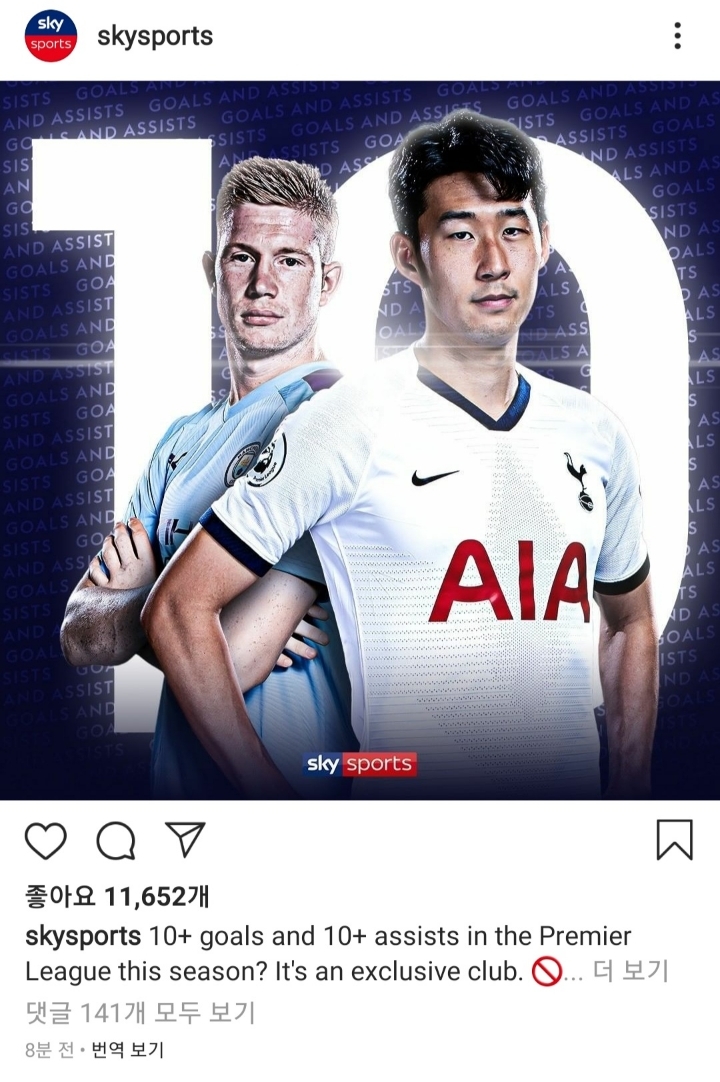 올시즌 10 득점 10 도움을 넘은 프리미어리그 선수는 손흥민과 덕배 단 둘 뿐!! (그 와중에 덕배는 11 득점 18 도움ㄷㄷ)