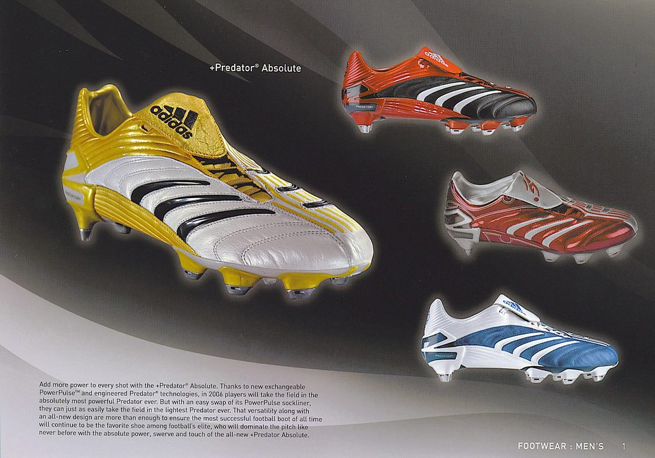 프레데터 앱솔루트는 2006년 월드컵 지단의 축구화로 유명합니다. 당시 결승전에서 지단은 대회를 기념하기 위해 금색의 프레데터 앱솔루트를 신고 나왔습니다. (하지만 축구화보다 박치기가 더 주목을 받은 대회가 되어버렸죠.)