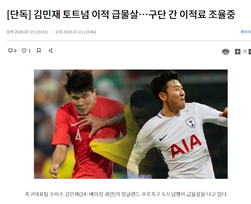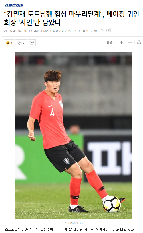 현재 김민재는 소속팀 베이징 궈안 훈련 복귀를 위해 중국으로 건너간 상태다. 지난 5일 중국으로 돌아간 김민재는 2주간의 자가 격리 기간을 보내면서, 유럽 현지 에이전트를 통해 토트넘과 협상을 이어가고 있는 것으로 알려졌다.