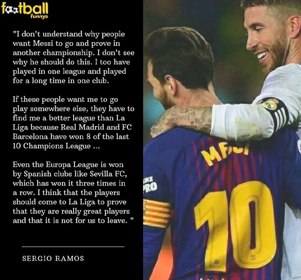 메시가 그래야 할 이유가 있는가? 나 역시도 한 리그, 한 클럽에서 오래뛰었고, 만약 사람들이 내가 다른곳에서 뛰는 걸 보길 원한다면 라리가보다 더 나은곳을 찾아야만 할 것이다.