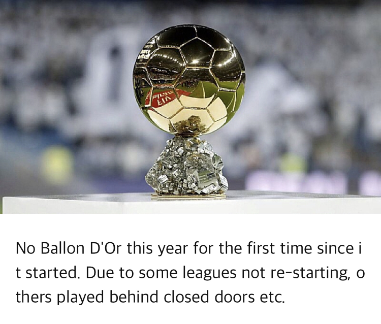 BBC - 64년 역사상 처음으로 발롱도르 시상식 취소 재개하지 않은 리그 + 무관중경기로 진행된 경기들 때문