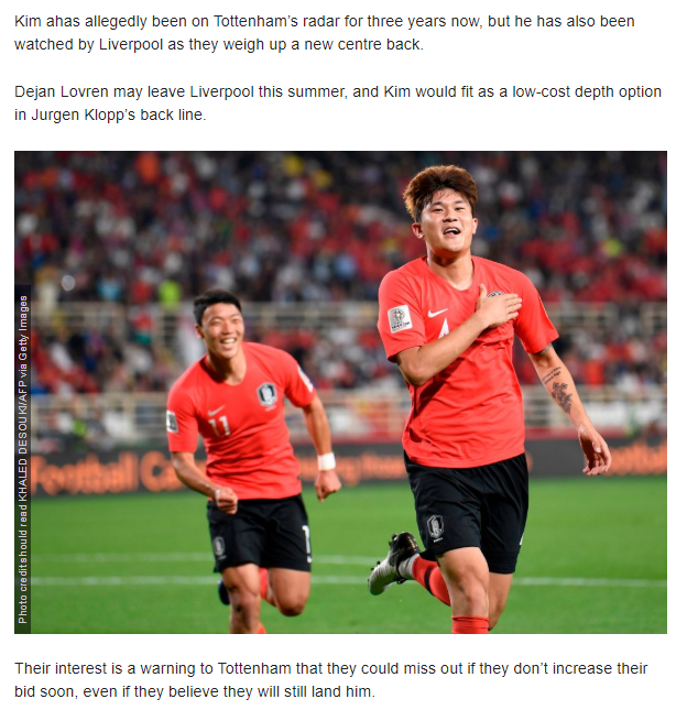 HITC'는 21일 "토트넘은 김민재를 주시하는 리버풀 움직임에도 그와 계약을 확신하고 있다(Tottenham Hotspur are confident of signing Beijing Guoan defender Kim Min-jae – despite Liverpool casting admiring glances his way)"면서 "베이징과 협상에서 좁혀야 할 이견이 적잖다. 그러나 토트넘은 조만간 합의점을 찾을 수 있을 것으로 낙관한다"고 전했다.