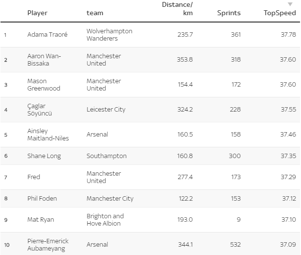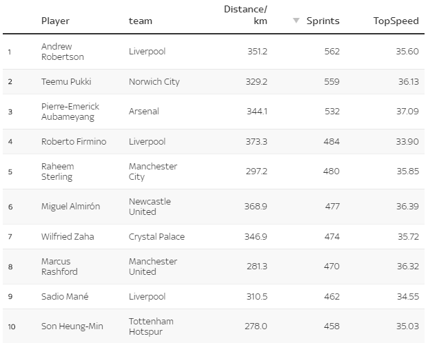 1. 앤드류 로버트슨 (562회) 2. 티무 푸키 (559회) 3. 피에르-에메릭 오바메양 (532회) 4. 호베르투 피르미누 (484회) 5. 라힘 스털링 (480회) 6. 미구엘 알미론 (477회) 7. 윌프레드 자하 (474회) 8. 마커스 래쉬포드 (470회) 9. 사디오 마네 (462회) 10. 손흥민 (458회)