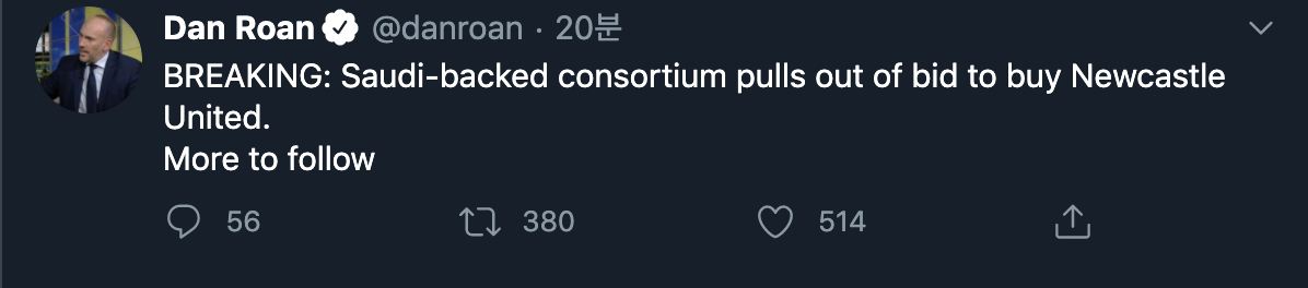 BBC속보 댄 론 - 사우디는 뉴캐슬 인수를 철수했다