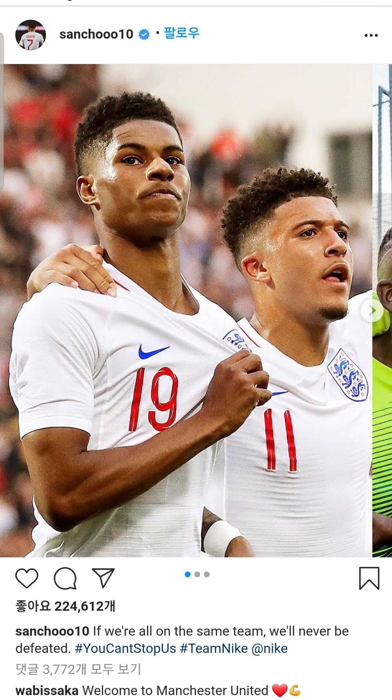 래시포드와 함께 있는 사진을 올리며 "만약 우리가 같은 팀이라면, 우린 절대 패배하지 않을 거야"라는 멘트를 함 (댓글에 완 비사카는 팬 계정임ㅋㅋ)