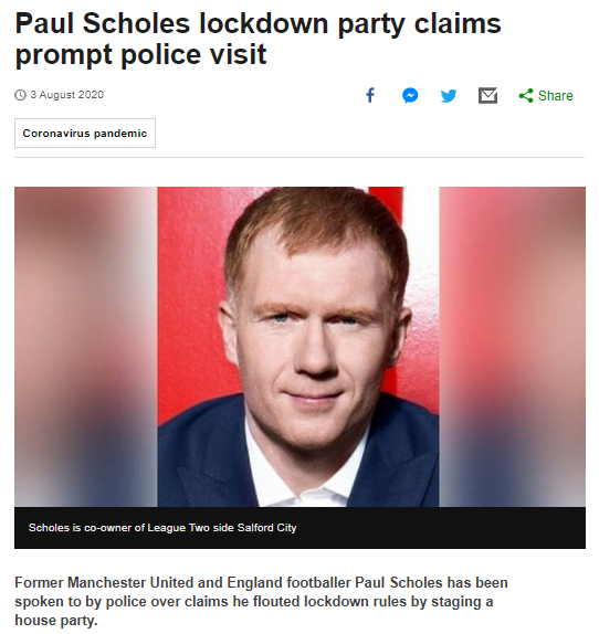 스콜스가 락다운 규정을 어기고 하우스 파티를 연 것에 대해 경찰조사를 받았다.