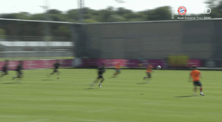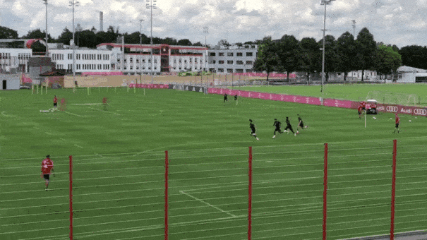 훈련 중 윙어 4인방 스프린트 장면. 가장 빠른 선수가 사네, 그 뒤에 그나브리, 엄청난 가속력 보여주는 선수가 코망, 가장 처지는 선수가 페리시치.