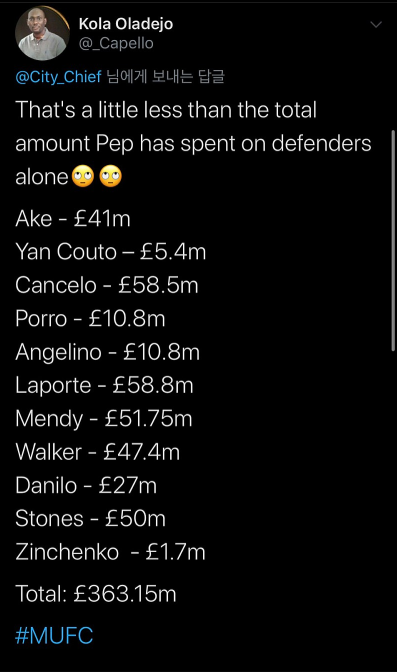맨유팬 : 응 펩이 수비수에 쓴 돈 보다는 적네~