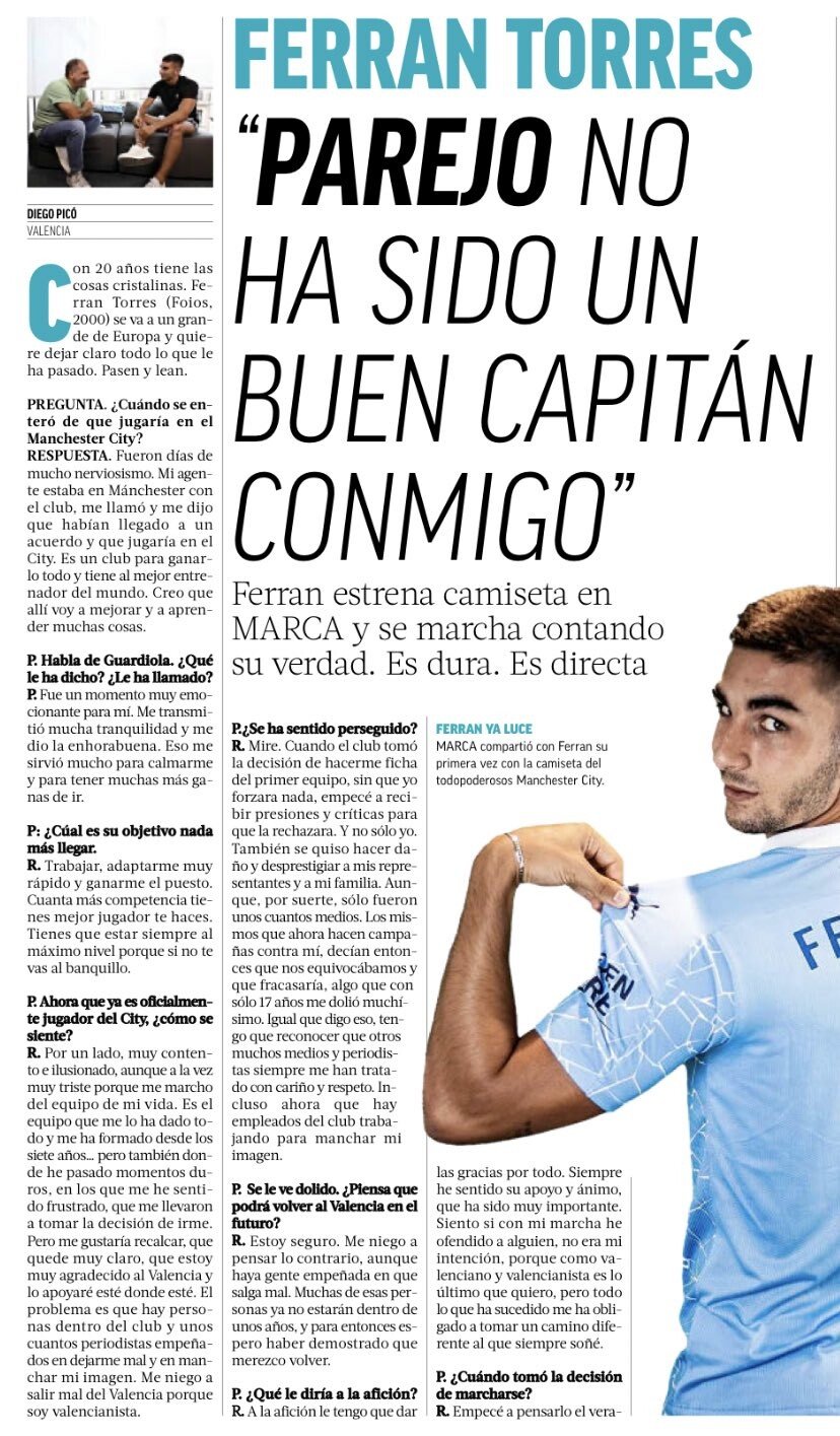 시티 웹사이트와의 인터뷰에서 토레스는 과르디올라 밑에서 뛰게 되어 기쁘다고 말했다. 그러나 수요일 마르카에 따르면 그는 좋은 관계인 상태에서 발렌시아를 떠나지 않았다.
