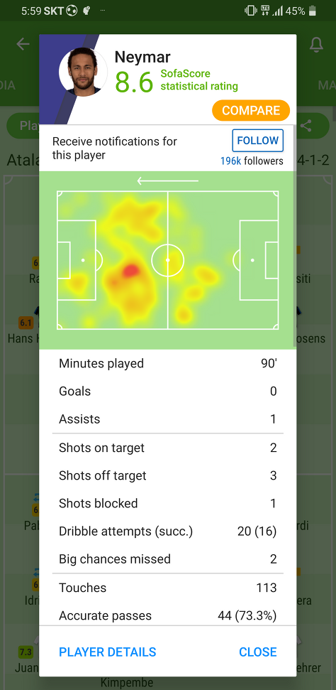 오늘자 네이마르의 '드리블 횟수와 성공률'