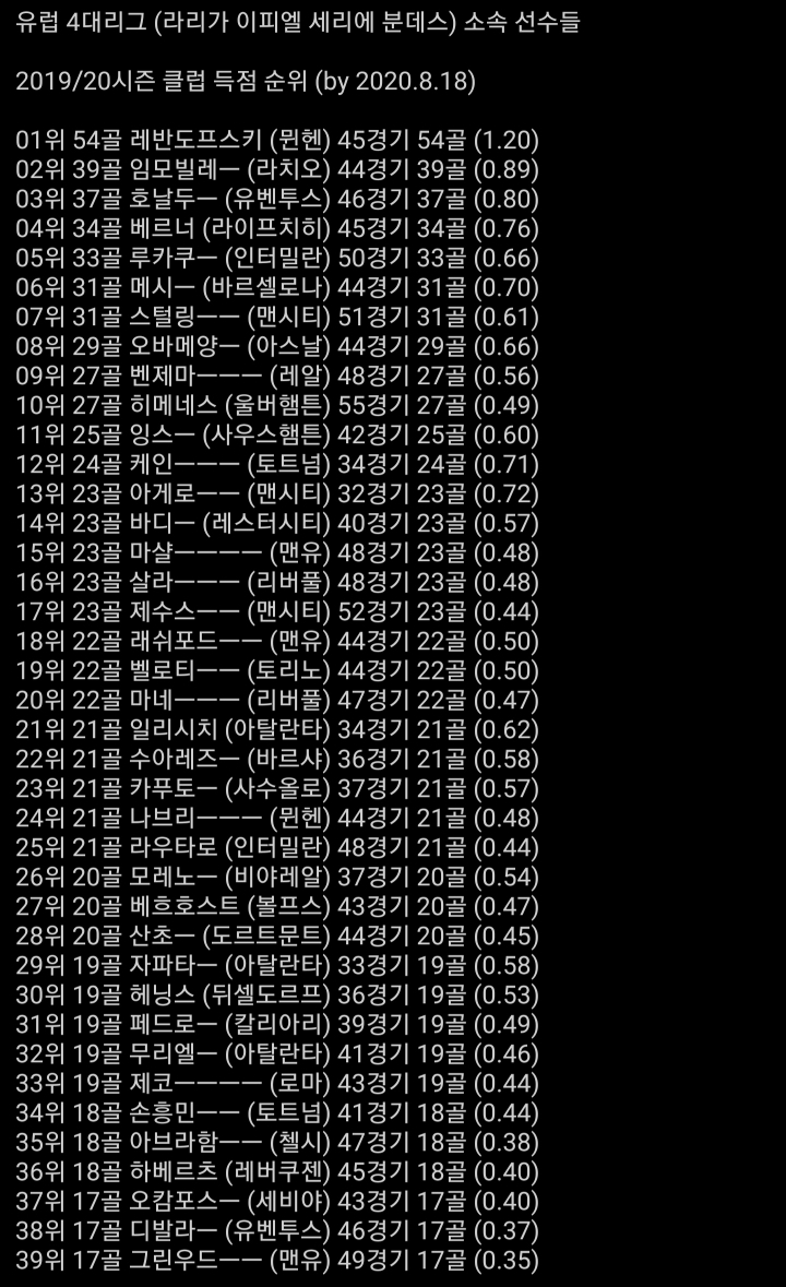 레반도프스키 넘사벽ㄷㄷ 메날두는 여전하네요ㅋㅋㅋ 29골 넣은 오바메양은 아깝..