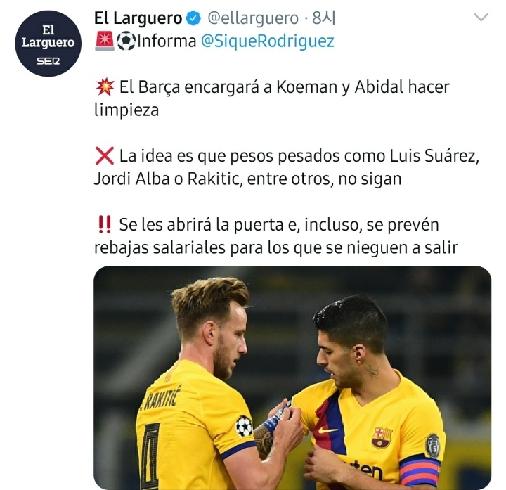 바르셀로나는 쿠만과 아비달에게 대형 선수들을 정리할 것을 지시할 예정이다. 포함된 선수는 수아레스, 알바, 라키티치 등.. 이적을 거부하면 감봉 조치도 가능
