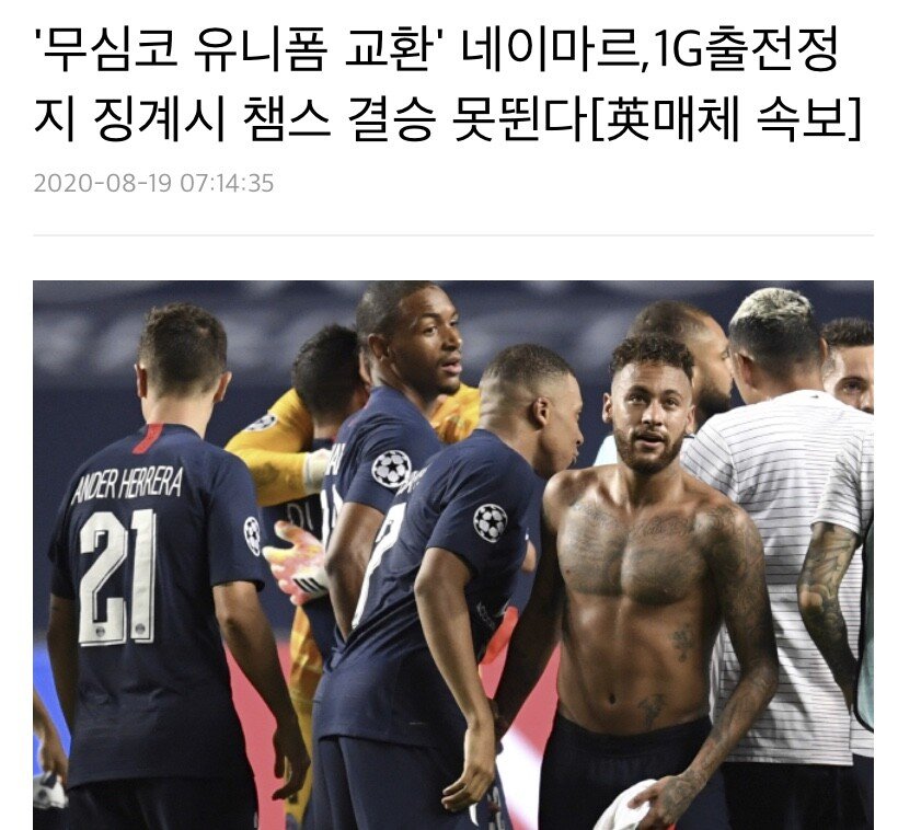 19일(한국시각) 영국 대중일간 더선은 '네이마르가 라이프치히와의 준결승전 3대0 완승 후 상대팀 수비수 마르셀 할슈텐버그와 유니폼 상의를 교환했다. 이것은 코로나 시대에 유럽축구연맹(UEFA)이 엄격히 금지한 행위로 1경기 출전정지 처분이 뒤따른다'고 보도했다.
