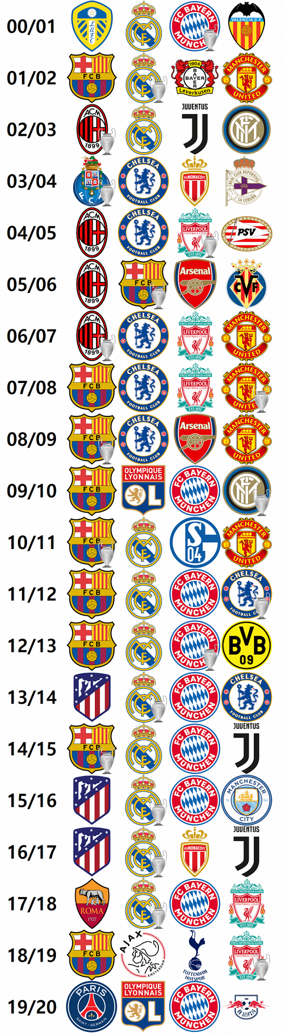 [최근 20년간, 챔스 4강 진출 팀 목록]