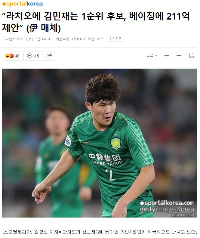 [라치오에 김민재는 1순위 후보, 베이징에 211억 제안]