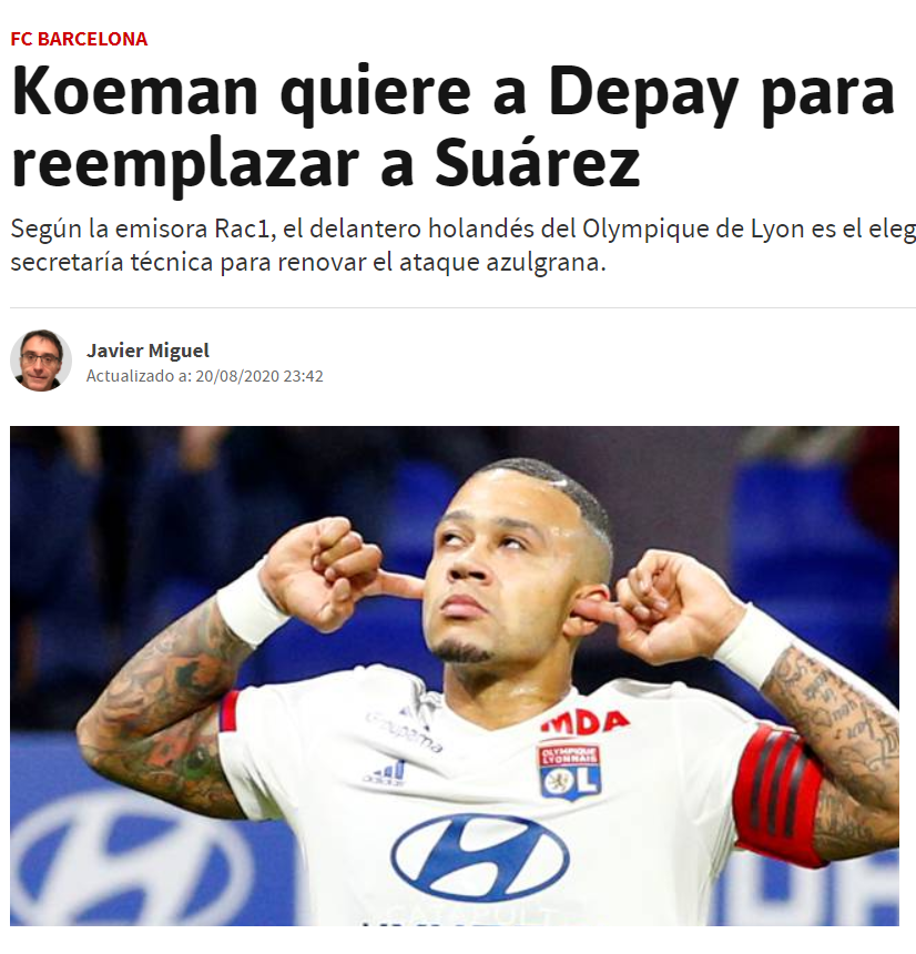Rac1에 따르면 쿠만은 바르셀로나의 공격력을 되살리기 위해 네덜란드의 스트라이커 데파이가 수아레스를 대체하길 원한다.