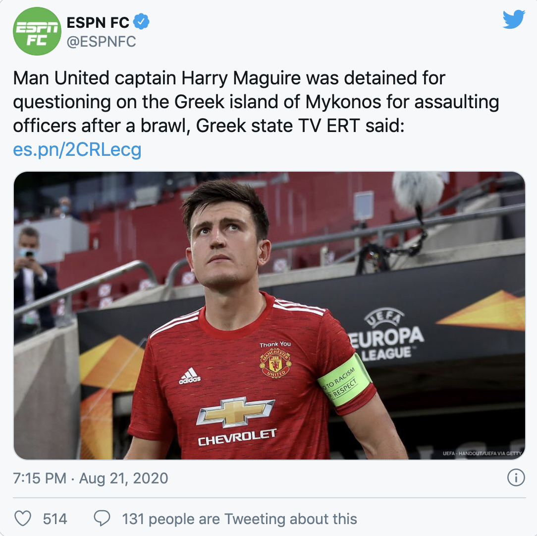 [[ESPN] 경찰폭행으로 연행된 맨체스터유나이티드의 매과이어]