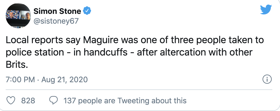 BBC- 사이먼스톤) 현지 보도에 따르면 매과이어는 수갑을 차고 경찰서로 연행된 3명 중 1명