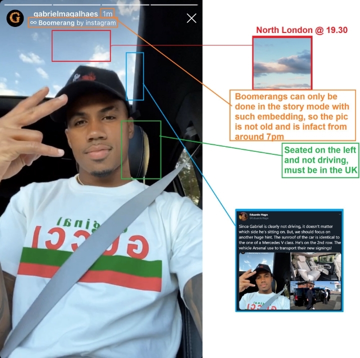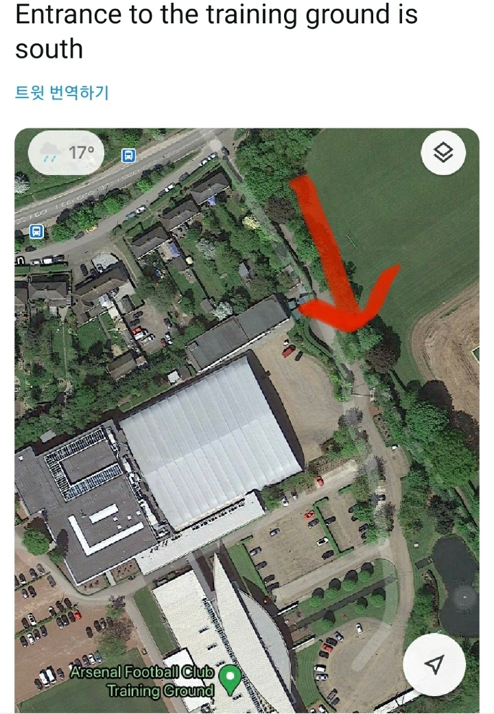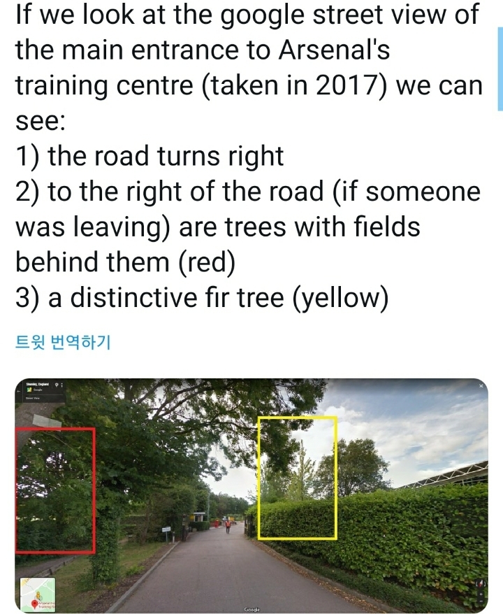 가브리엘 마갈레스가 올린 인스타 사진 분석ㄷㄷ 1. 하늘보고 날씨, 시간 추리 2. 좌석 보고 나라 추리 3. 차량 디자인으로 아스날이 선수데려올 때 쓰는 벤츠 차량인거 알아냄 4. 콜니 입구 양 쪽 나무로 방향 추리 5. 사진에 햇빛 방향으로 차량이 남쪽을 향하며 구글뷰로 훈련장 입구 방향이랑 일치함을 추리