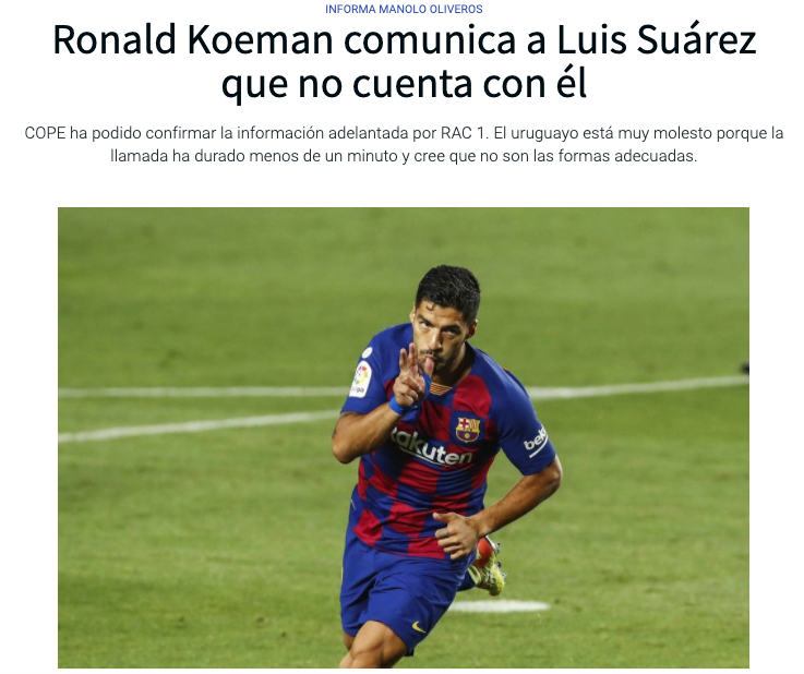 Además, según ha desvelado Manolo Oliveros, Suárez está muy molesto tras la llamada de Koeman porque la conversación ha duradomenos de un minuto y el uruguayo considera que no son las formas adecuadas de tratar a un futbolista que lo ha dado todo por el club.